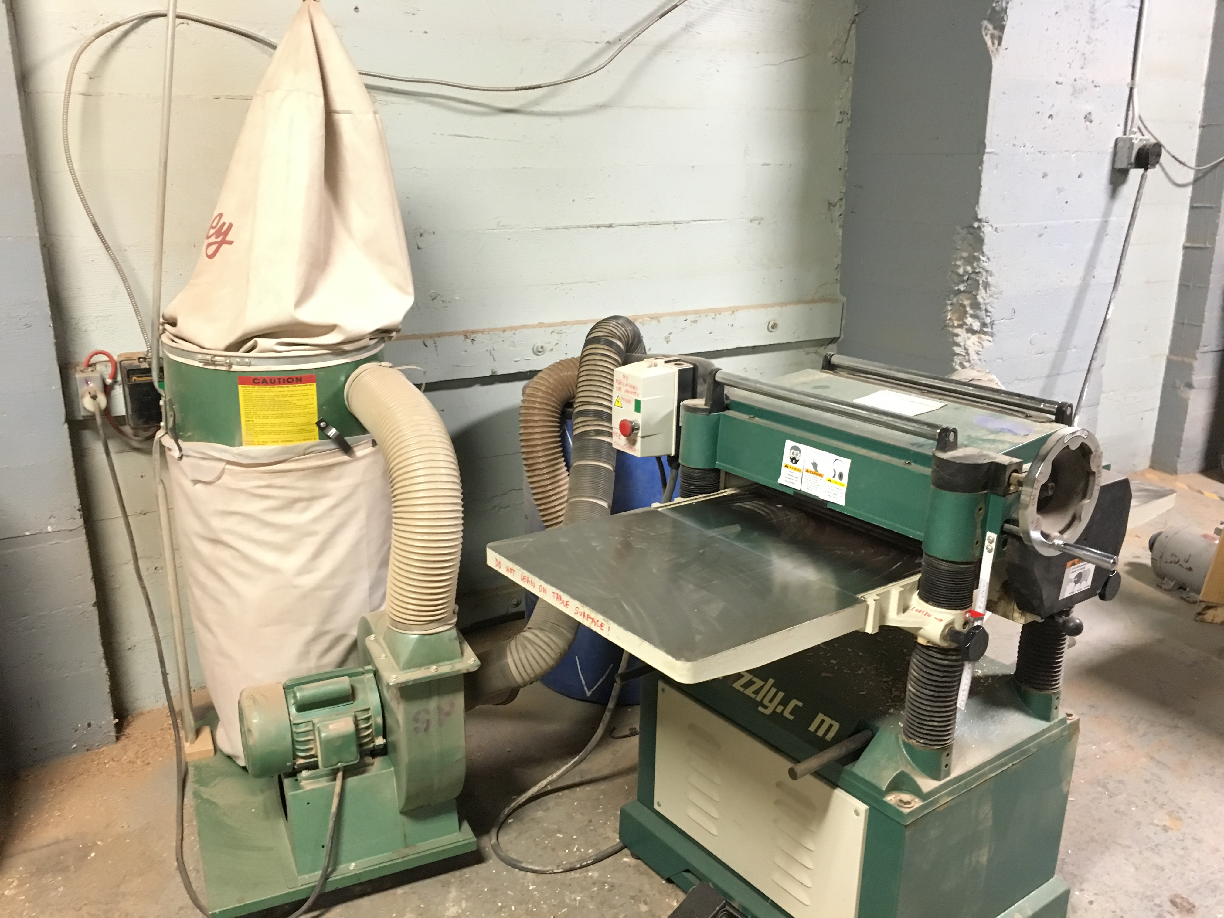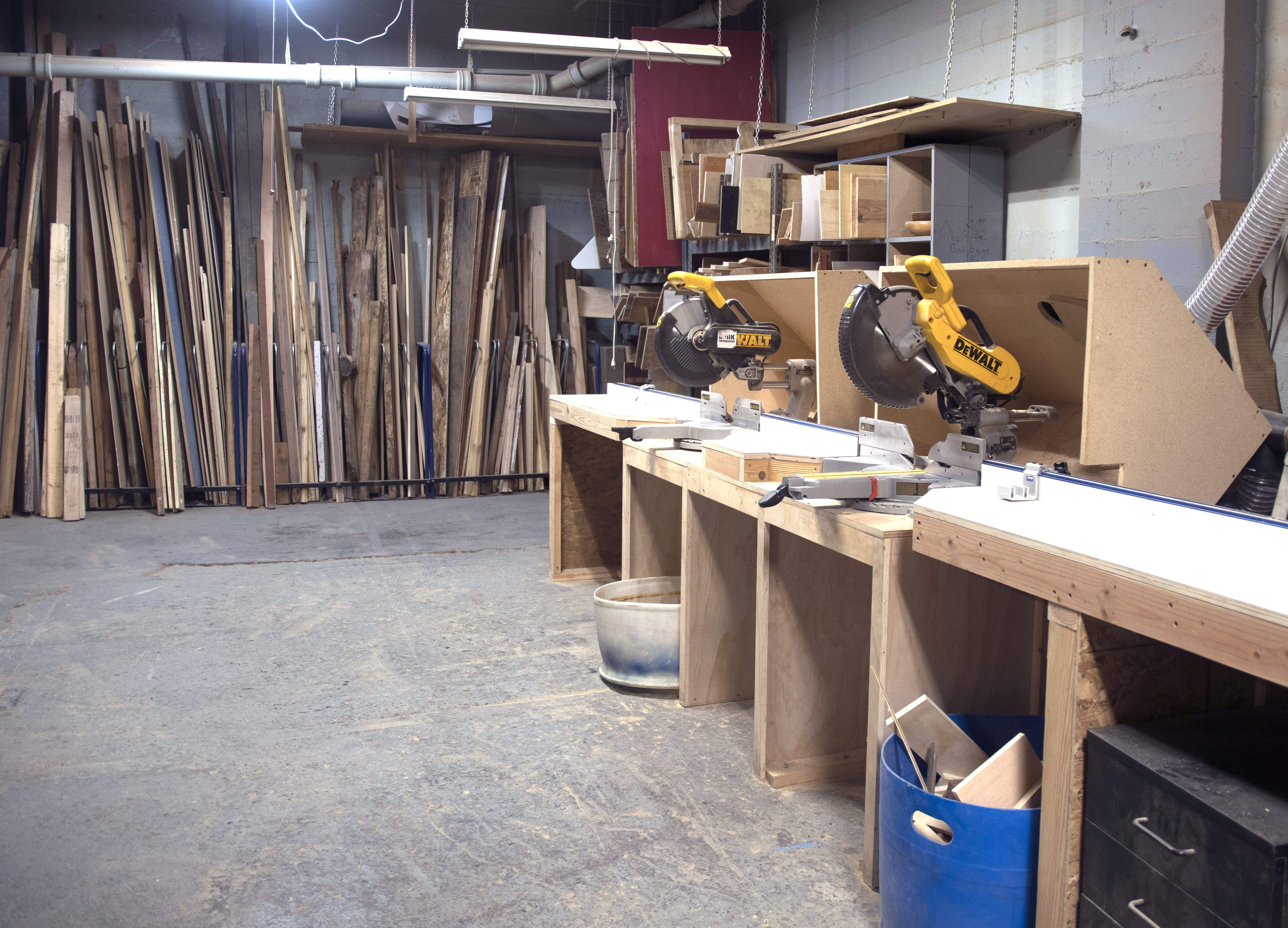 In total, ~4,500 sq ft of wood shop space. Our Lower Shop has 13 foot ceilings, concrete floors, eight common tables and large machines. Our Upper Shop has 10 foot ceilings, wood floors and quiet space.